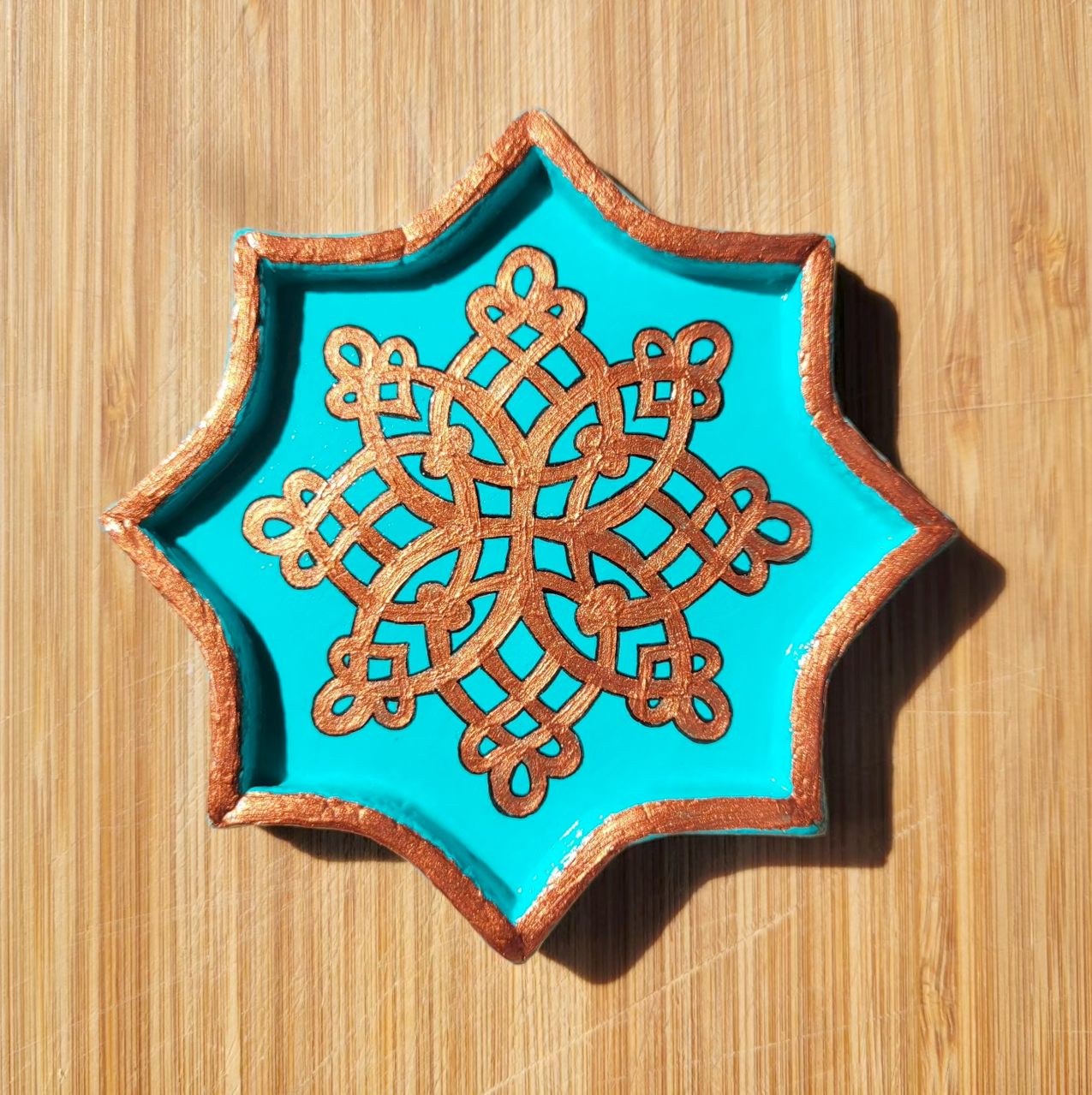 Trinket dish in the shape of an 8-pointed star made from air dry clay and painted with acrylic paints. Pattern based on a pattern found in Uzbekistan.